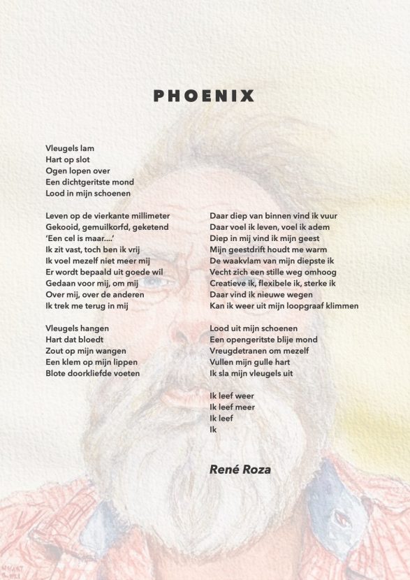 Mijn vriend Fred Rosenhart, kunstschilder, heeft het schilderij van mij gemaakt in mijn diepste Corona-fase. (deze is zichtbaar achter het gedicht)